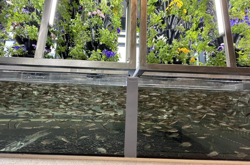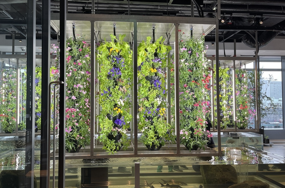 2階にあるBOTANICAL Labは、(株)AGRIKOとルミネが連携して運営する、都市型アクアポニックスファームです。アクアポニックスとは、循環型農業システムのこと。ここでは全長約6m の水槽と30本の栽培タワーを備えたオリジナルの栽培設備で、エディブルフラワーやハーブ、葉物野菜を育てると同時に魚を養殖しています。その様子は、まるで小さな楽園のよう。栽培されている美しい植物は、見ているだけで気持ちが癒されます。