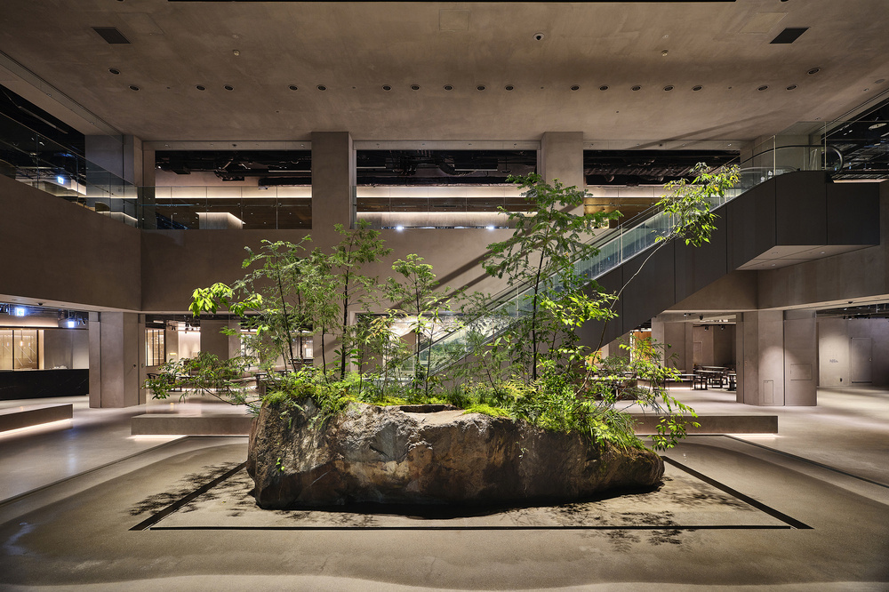 中でも、ひときわ目を引くのが、2階エスカレーター脇にある「翠岩の丘(すいがんのおか)」と名付けられたアトリウム。神奈川県の舞鶴半島で採掘された直径約5mの岩材の上に草木を育てたオブジェは、天井から降る雨の演出も行われ、室内とは思えないほど見事な光景を見せてくれます。