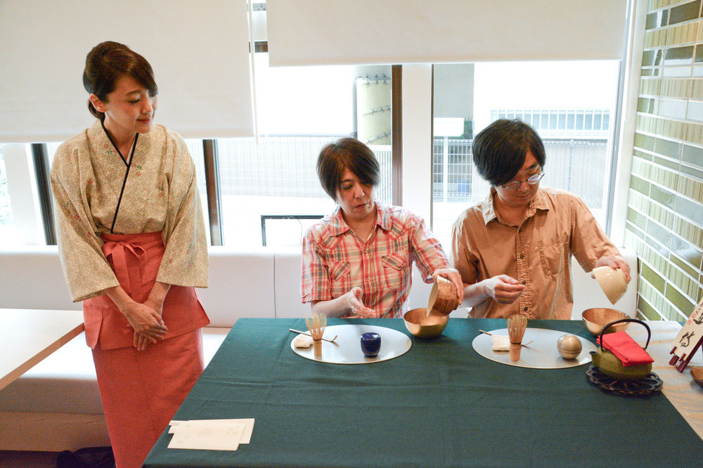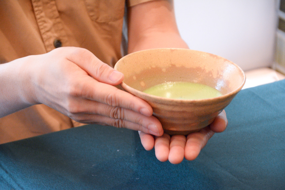 さて、いよいよお茶を飲んでみましょう。美しい作法でインストラクターがお茶をたててくれます。お茶を出されたらまず「お点前頂戴いたします(Thank you for your tea)」とご挨拶をします。そして右手で茶碗を持ち、左手のひらに乗せ感謝をし、右手で時計回りに2度回します。