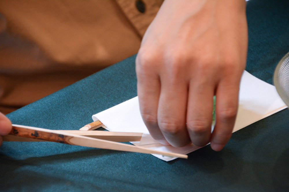 使ったお箸は懐紙の端を少し折り曲げて、きれいに拭って器に戻します。