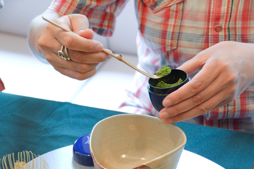 それではお茶をたてましょう。「濃茶」と「薄茶」という2種のお茶がありますが、今回は初心者向けの薄茶のたて方です。「なつめ(natsume)」と呼ばれる容器から、「茶杓(ちゃしゃく)」と呼ばれる小さな匙で、抹茶の粉末を2度ほどすくって茶碗に入れていきます。