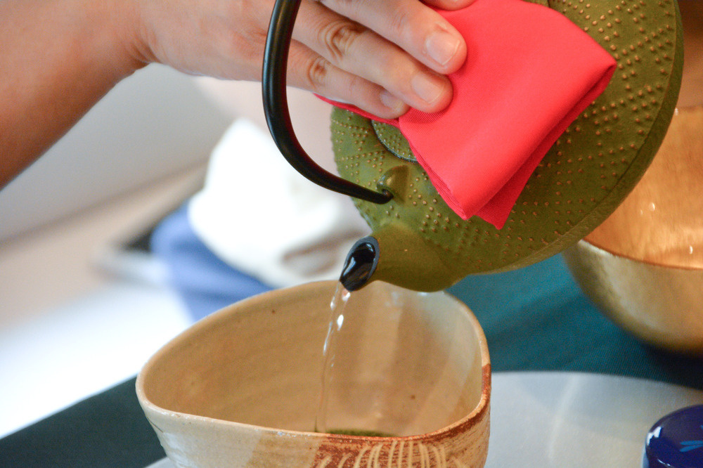 袱紗(ふくさ)と呼ばれる布を鉄瓶にあて、お湯を60ml入れていきます。火傷をしないようにゆっくり落ち着いて。