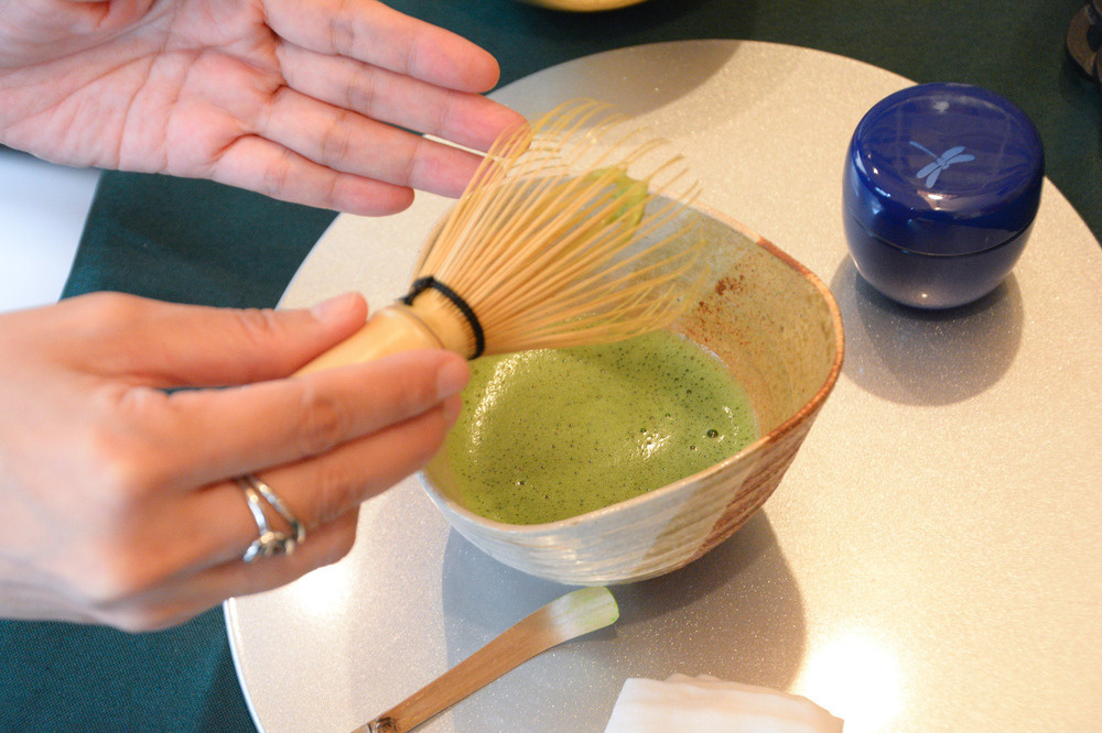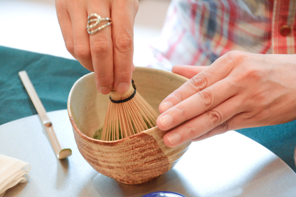 茶せんを指先でつまんで、お茶をたてます。手首を使って素早く茶せんを動かします。このとき重要なのは「茶せんは、回すのではなく前後に動かす」ことです。少し難しいかもしれませんが、教わった通りに心を落ち着けて臨めば、きっと上手にお茶がたてられるはずです。